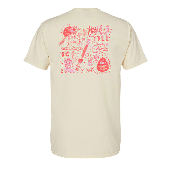 Show off your cowgirl spirit with the Long Live Cowgirls short-sleeve graphic tee. Featuring a fun, girly design with a guitar, cowgirl boots, hat, horseshoe, and more, this shirt celebrates the bold, free-spirited lifestyle. Perfect for rodeo days, country nights, or anytime you're feeling Southern and strong!