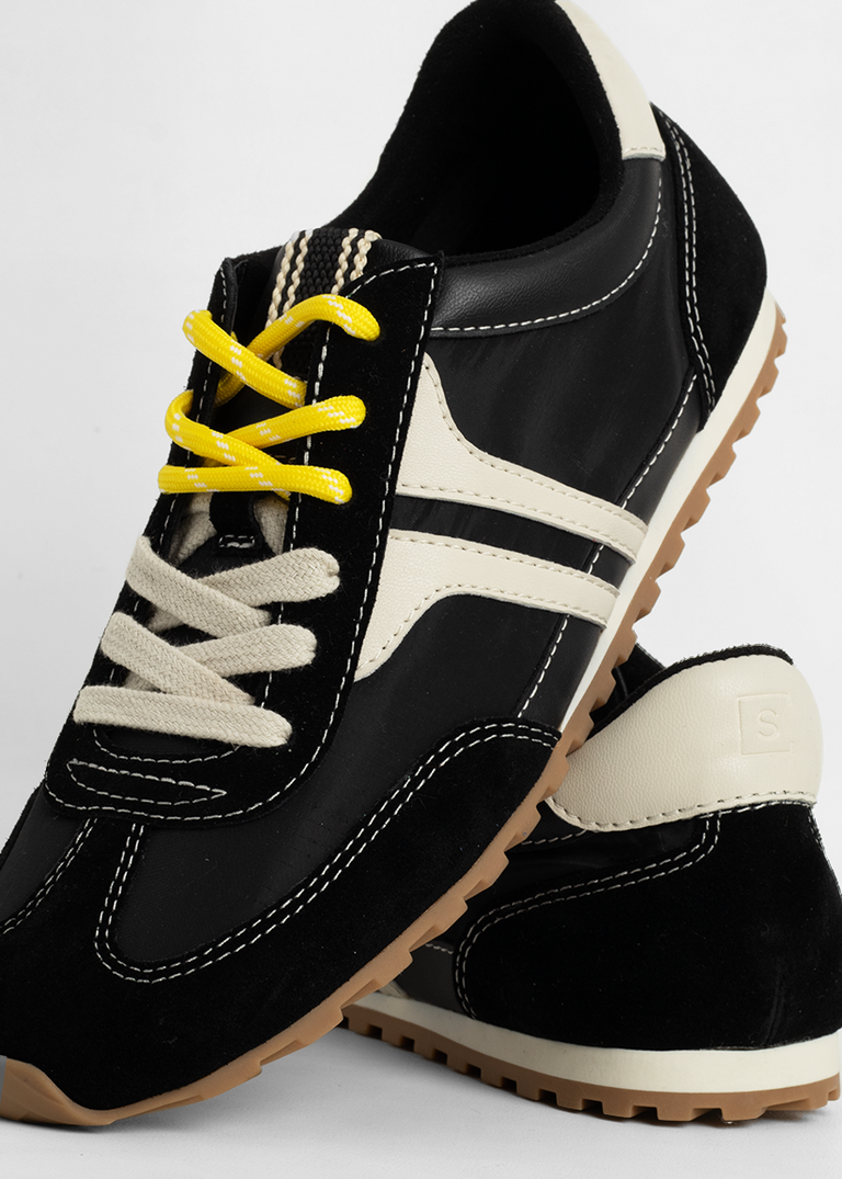 A sleek essential with vintage attitude. The SARAH in Black delivers timeless cool with its contrast white details, low-top silhouette, and subtle stitching that nods to retro running shoes. Whether you're styling it with denim, cargos, or a tailored look-it brings polish with an edge. Ready to wear on repeat, all year long.