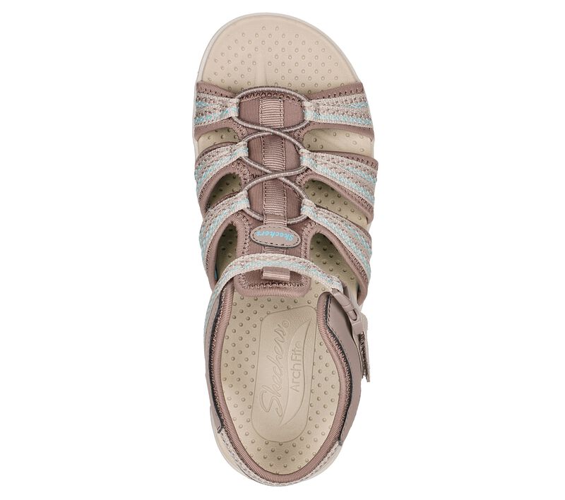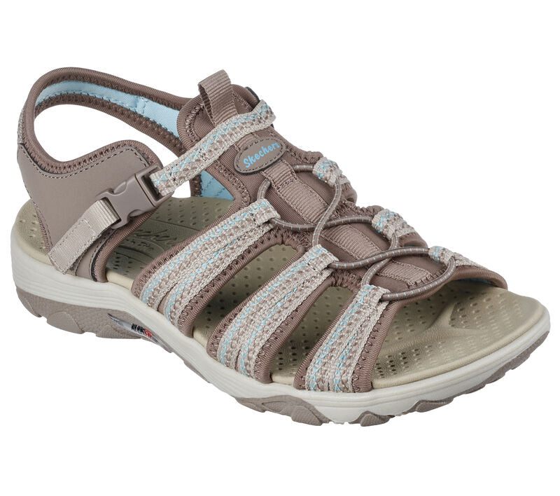 Trek the trails in long-lasting comfort with Skechers Arch Fit® Reggae. This outdoor trail sandal features a synthetic and woven fabric upper with stretch laces, release buckle closure, plus a supportive Arch Fit® footbed.