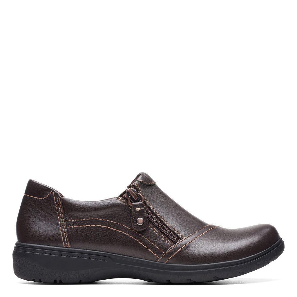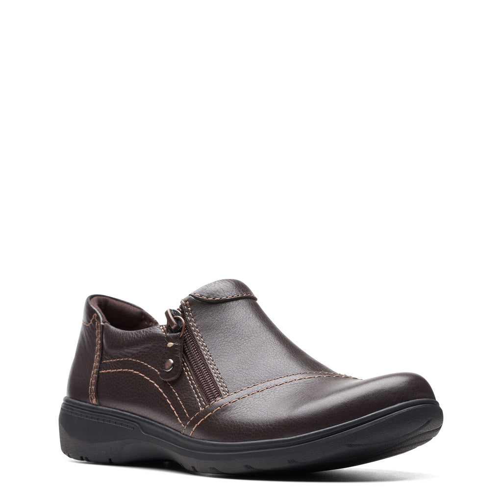 Enjoy the finest of comfort and style in the Clarks Carleigh Ray womens slip-on. The leather upper and smooth lining keep feet feeling cool, comfortable and dry. What's more, the side zipper closure makes it easy to get in and out of these fashionable shoes. Take these comfortable flats to work or play.